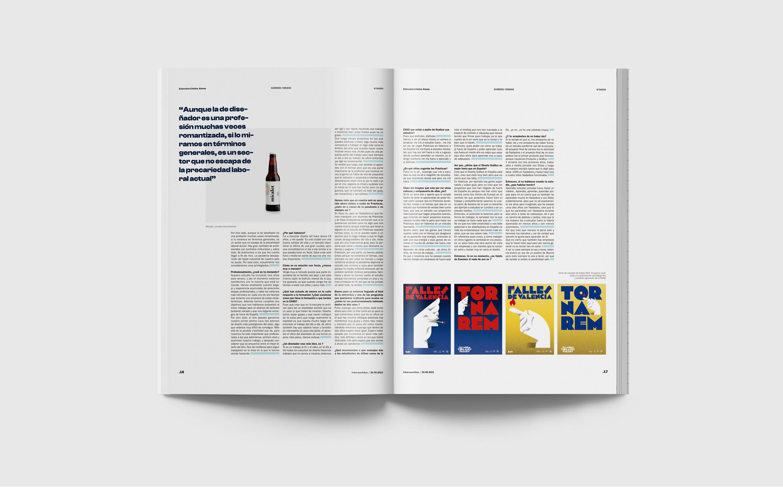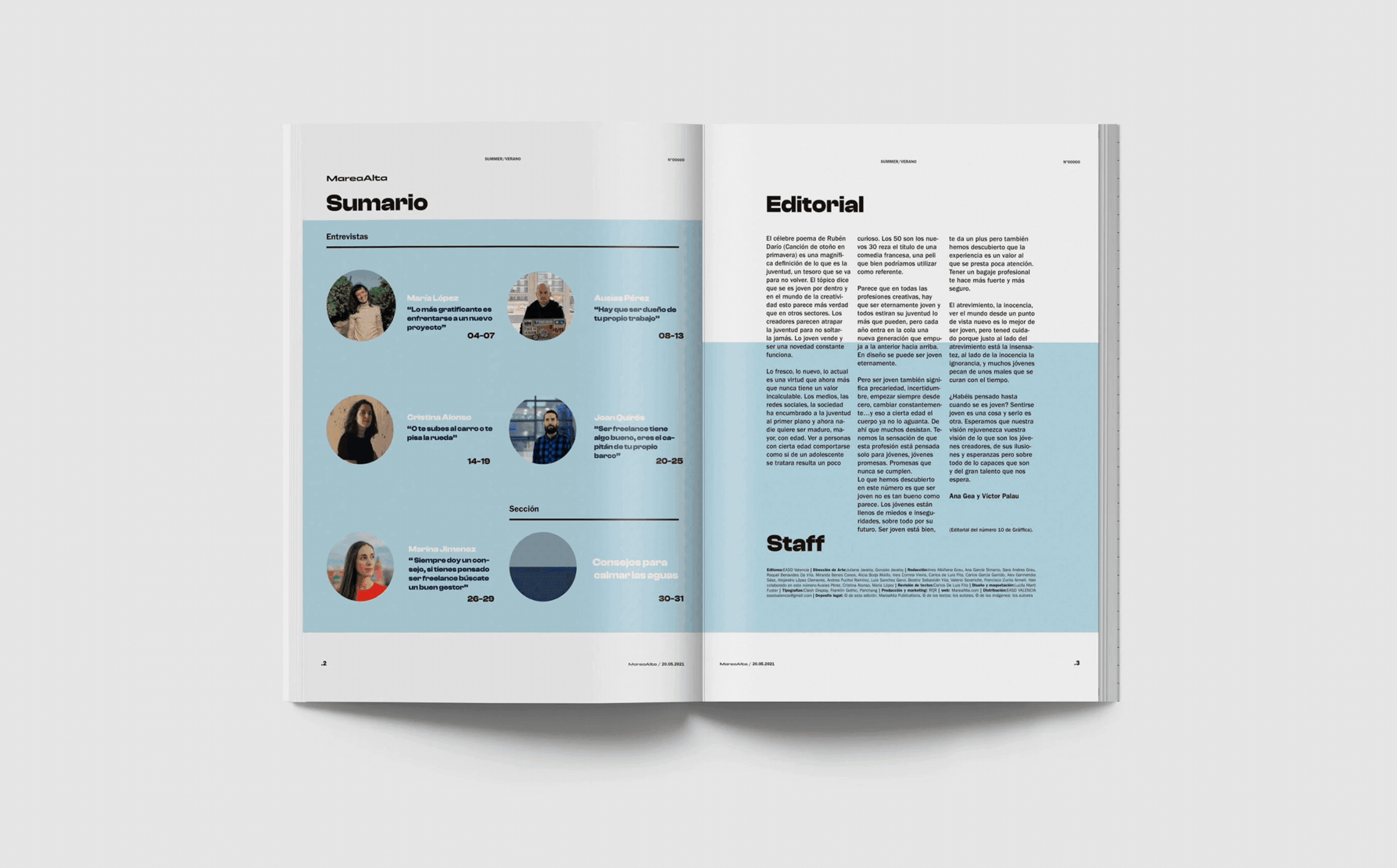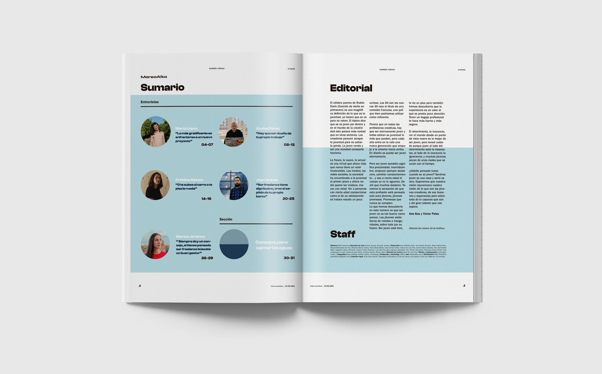 MareAlta is a magazine created for the students of the EASD (Escola D’Art Superior i Disseny de València).In this edition, the magazine focuses on interviews made to former students, where they talk about their experience when starting in the working world and what were their first steps in this chaotic path of starting a job.With a minimalist style and alluding to the name of the magazine, it is intended to represent how finishing university can be a huge sea of doubts.